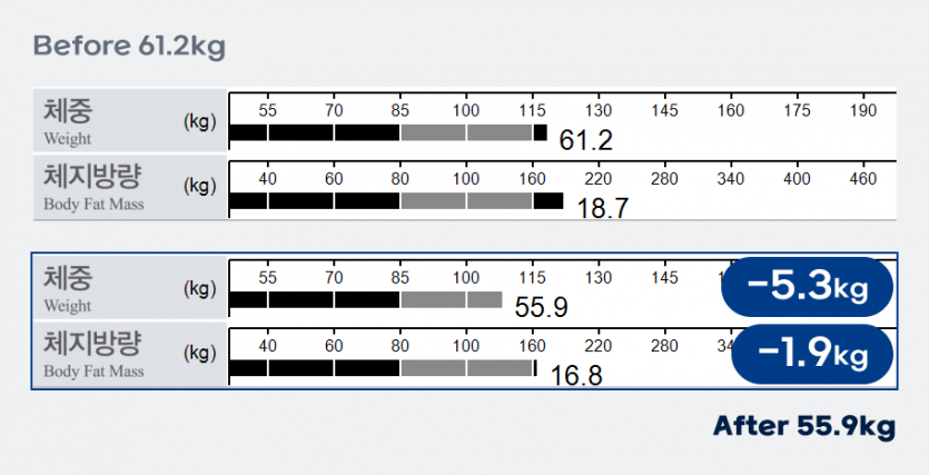 자신감이 체형으로 드러나는 순간 프로그램 영롱 다이어트 프로그램 프로그램 상세내용 다이어트 탕약 다이어트 치료 총감량 5.3kg 체지방 감소 1.9kg 감량전후 61.2kg 55.9kg 나이 30 신장 157 성별 여 기간 2개월 한줄 후기 자신감이 체형으로 자연스럽게 드러나는 순간이었습니다. 2개월 동안 영롱 다이어트 프로그램으로 5.3kg 감량했고, 체지방도 1.9kg 줄었어요. 몸무게뿐 아니라 라인까지 달라져 거울 보는 시간이 즐거워졌습니다. 내 몸의 변화를 느끼고 싶은 분들께 적극 추천합니다! 상세 DATA 목록